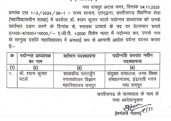 रायपुर। राज्य शासन शासकीय नागार्जुन स्नातकोत्तर विज्ञान महाविद्यालय रायपुर मे (महाविद्यालयीन शाखा) में कार्यरत डॉ. श्याम कुमार पटले पदोन्नत प्राध्यापक को उनके कार्यभार ग्रहण करने के दिनांक से, स्नातक प्राचार्य के पद पर वेतनमान रूपये 37400-67000+10000/- ए.जी.पी. +2000 विशेष भत्ता में पदोन्नत कर उच्च शिक्षा संचालनालय, इंद्रावती भवन नवा रायपुर में संयुक्त संचालक बनाया है।