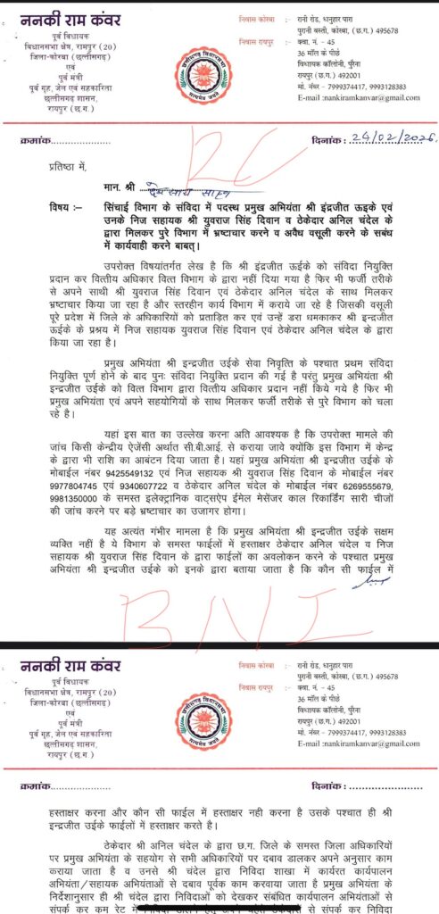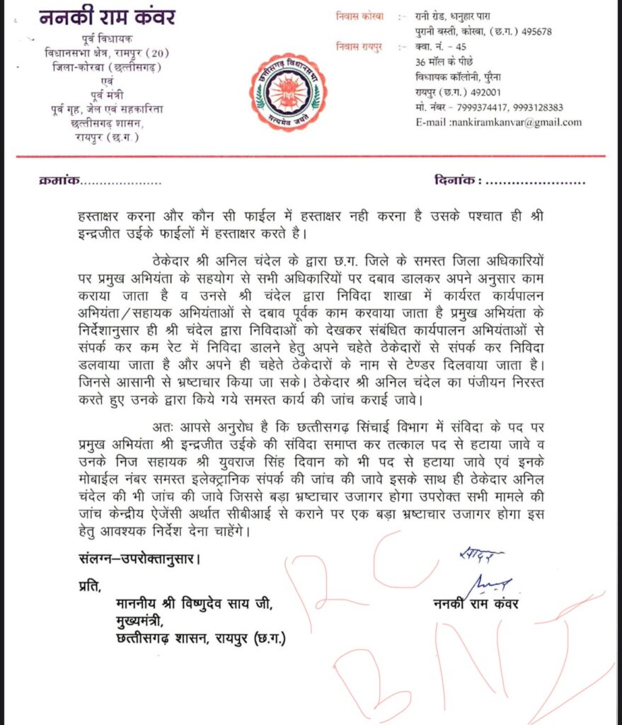 छत्तीसगढ़ के पूर्व गृहमंत्री और भाजपा नेता ननकीराम कंवर फिर एक बार चर्चे में है। दरअसल उनका पत्र वायरल हो रहा है जिसमे उन्होंने सीएम साय से शिकायत की है। पत्र में लिखा है कि इंद्रजीत ऊईके को संविदा नियुक्ति प्रदान कर वित्तीय अधिकार वित्त विभाग के द्वारा नहीं दिया गया है फिर भी फर्जी तरीके से अपने साथी युवराज सिंह दिवान एवं ठेकेदार अनिल चंदेल के साथ मिलकर भ्रष्टाचार किया जा रहा है और स्तरहीन कार्य विभाग में कराये जा रहे है जिसकी वसूली पूरे प्रदेश में जिले के अधिकारियों को प्रताड़ित कर एवं उन्हें डरा धमकाकर इन्द्रजीत ऊईके के प्रश्रय में निज सहायक युवराज सिंह दिवान एवं ठेकेदार अनिल चंदेल के द्वारा किया जा रहा है।