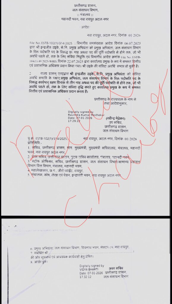 प्रमुख अभियंता इन्द्रजीत उईके सेवा निवृत्ति के पश्चात प्रथम संविदा नियुक्ति पूर्ण होने के बाद पुनः संविदा नियुक्ति प्रदान की गई है परंतु प्रमुख अभियंता इन्द्रजीत उईके को वित्त विभाग द्वारा वित्तीय अधिकार प्रदान नहीं किये गये है फिर भी प्रमुख अभियंता एवं अपने सहयोगियों के साथ मिलकर फर्जी तरीके से पुरे विभाग को चला रहे है।