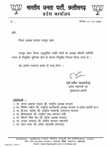 रायपुर। पिछले दिनों जिला अध्यक्ष भाजपा रायपुर शहर अध्यक्ष ने अनुसूचित जाति मोर्चा के अध्यक्ष पद पर श्रीमती सावित्री जगत को नियुक्त किया था लेकिन प्रदेश महामंत्री एवं मुख्यालय प्रभारी डा. नवीन मारकंडेय ने उनकी नियुक्ति को त्रुटिवश होने के कारण निरस्त कर दिया है और यह आदेश तत्काल प्रभाव से लागू होने के निर्देश दिए।